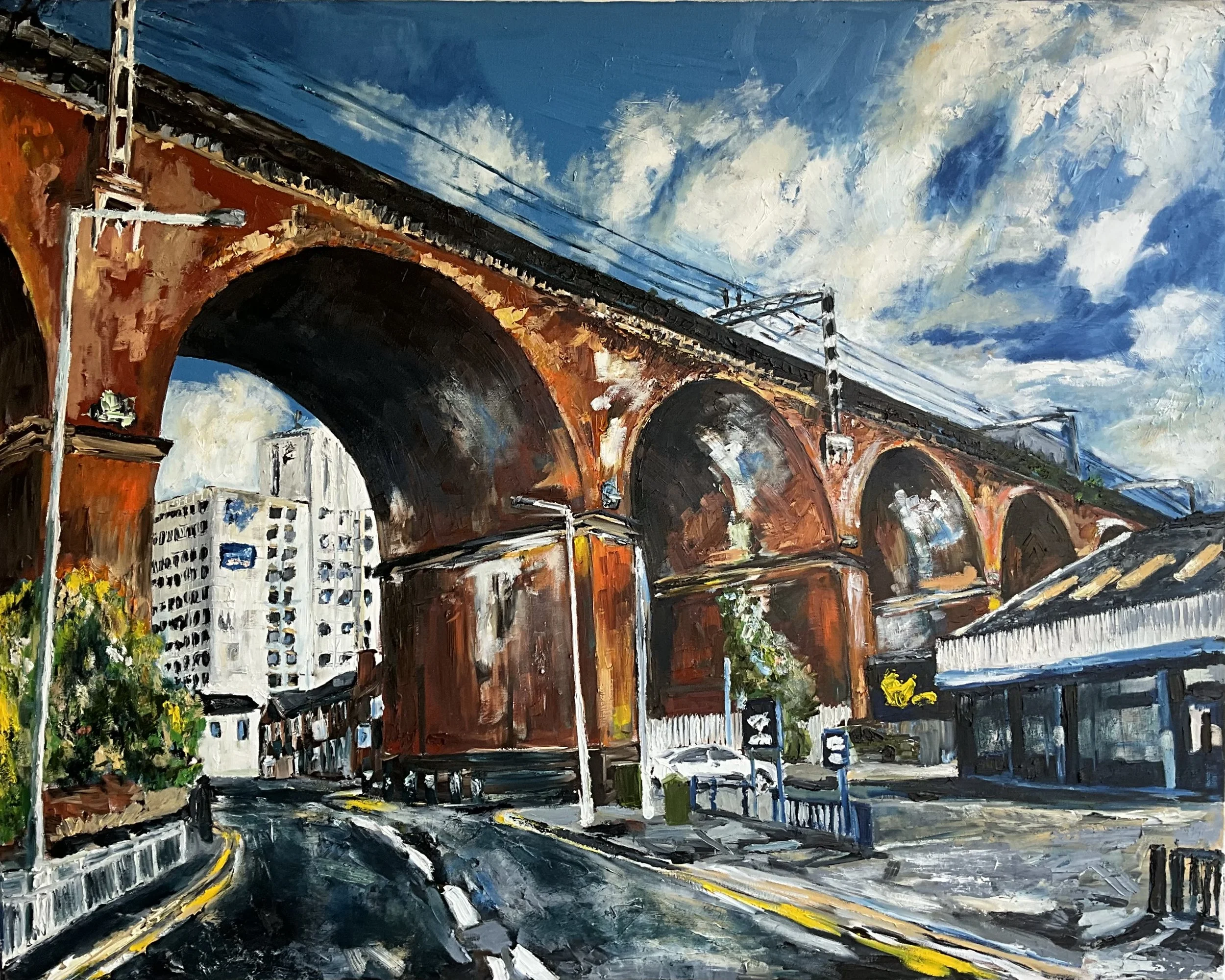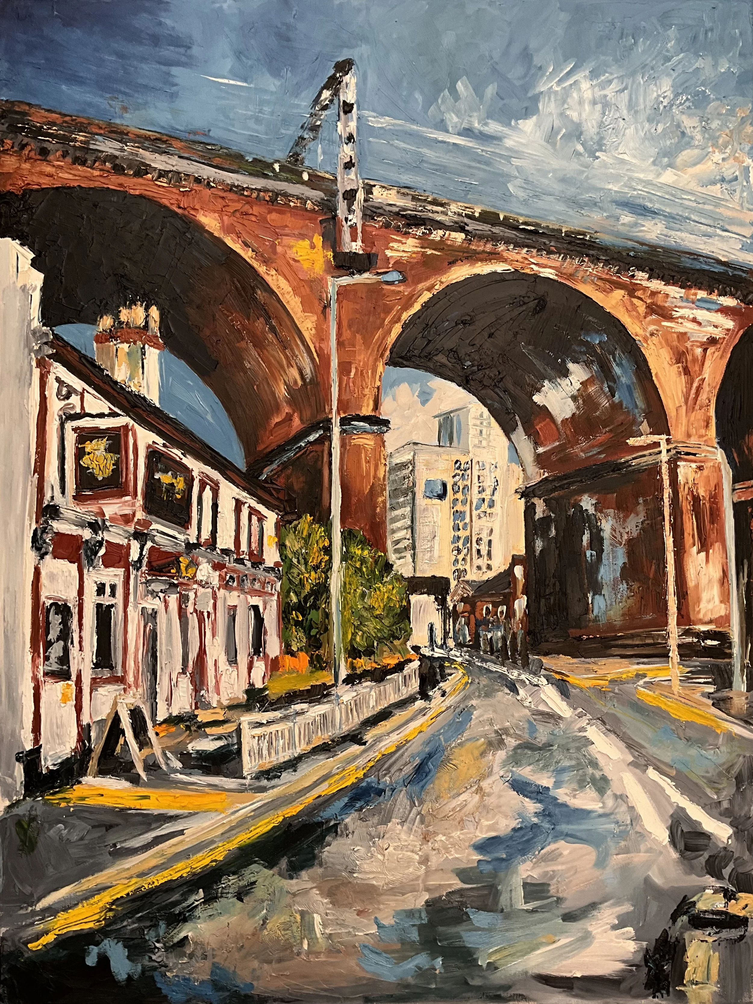 Chaz Newton-Smith is known for his bold, expressive style, drawing influence from the Abstract Expressionist movement while incorporating local landmarks and everyday stories. His paintings often capture the energy of urban life, nature, and architecture, blending rich textures and dynamic brushwork to create striking, immersive pieces.