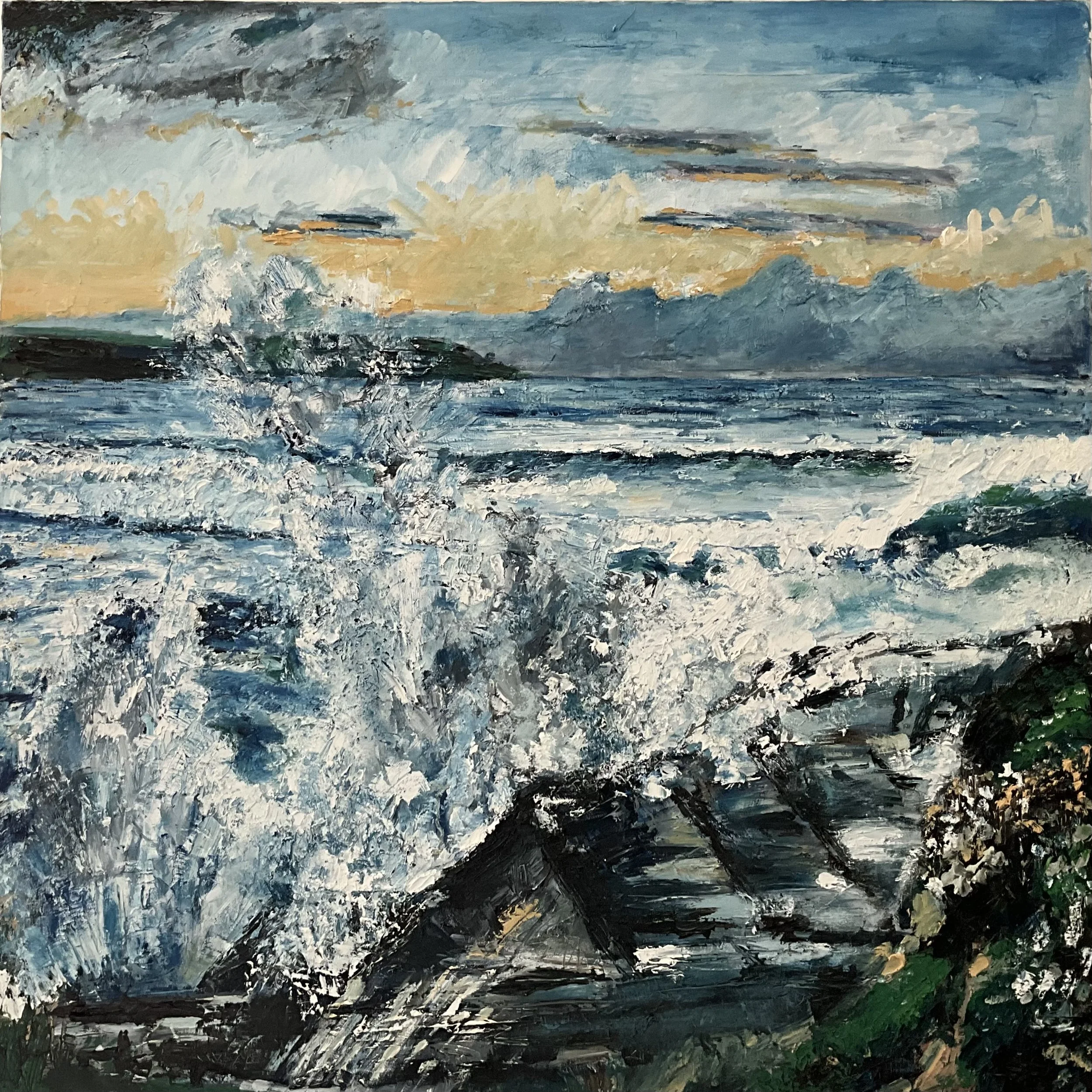 There’s a brief moment at Hayley Bay when golden light transforms the landscape—waves shimmer, shadows lengthen, and the scene takes on an almost mythic intensity. It was during this fleeting golden hour that artist Chaz Newton-Smith painted this striking piece, braving fierce winds and a restless sea.