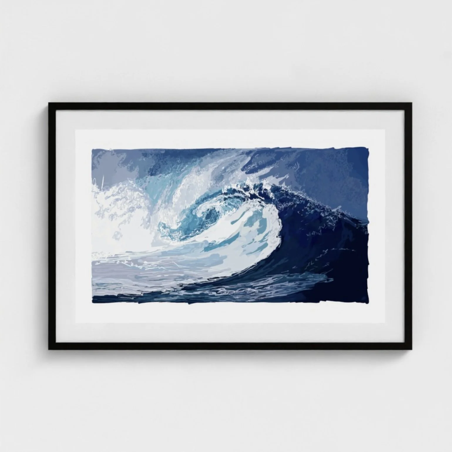 Bold and immersive, Big Wave is a powerful digital vector piece by Chaz Newton-Smith, capturing the drama and energy of crashing waves in motion. Printed on high-quality EMA 200gsm fine art paper, this work is set in a box frame with a Snow White mount and Perspex glaze. The clean, modern presentation enhances the depth and movement of the piece, making it a striking focal point for any space.
