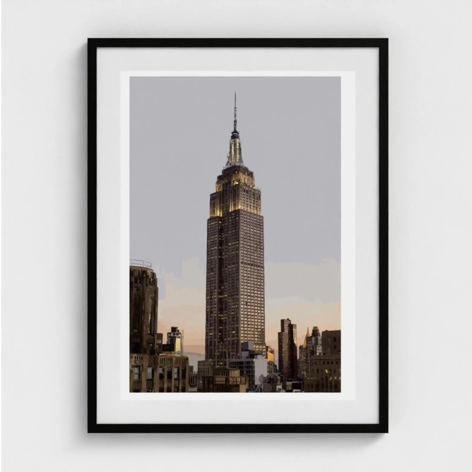A bold reinterpretation of a global icon, Empire State is a dynamic digital vector artwork by Chaz Newton-Smith. Created in expressive vector strokes, this piece captures the towering elegance of the Empire State Building with modern energy and architectural clarity. Printed on EMA 200gsm fine art paper and framed at 60x80cm (24x32”), it features a Snow White mount, Perspex glaze, and a deep box frame for a clean, gallery-standard finish. A striking piece that brings New York’s skyline into your space with style and presence.
